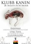Den 28 August er det klart for semesterets første Klubb Kanin, som for anledningen tar plass på Ni Muser. Kvelden byr på et utsøkt utvalg artister fra inn- og utland som alle opererer i de eksperimentelle elektroniske landskap. Vi har Utku Tavil, opprinnelig fra Istanbul i Tyrkia, men nå boende i Turin i Italia, som kommer for å fremføre sine «live electronics». Vi har Endphase, som er en trio bestående av de Berlinboende spanjolene João Pais, Servando Barreiro og Alberto Bernal Corral, som driver med det de kaller «konzeptuelle elektronik-improvisation». Og vi har duoen Cloudbuilder fra Oslo, bestående Arne Borgan og Ulf A. S. Holbrook, som driver med eksperimentell elektronika.